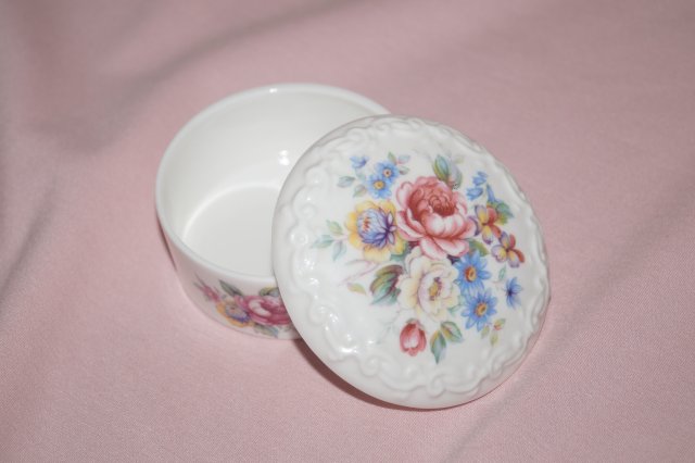 lekka porcelana w kolorze mlecznym ozdobiona motywem kwiatowym w przyjemnych kolorach szkliwiona na błyszcząco, dodatkowo wieczko ozdobione motywem tłoczonym, nie jest to porcelana najwyższej jakości ale cieszy oko:), bardzo romantyczne i kobiece, idealne do przechowywania drobnych bibelotów,