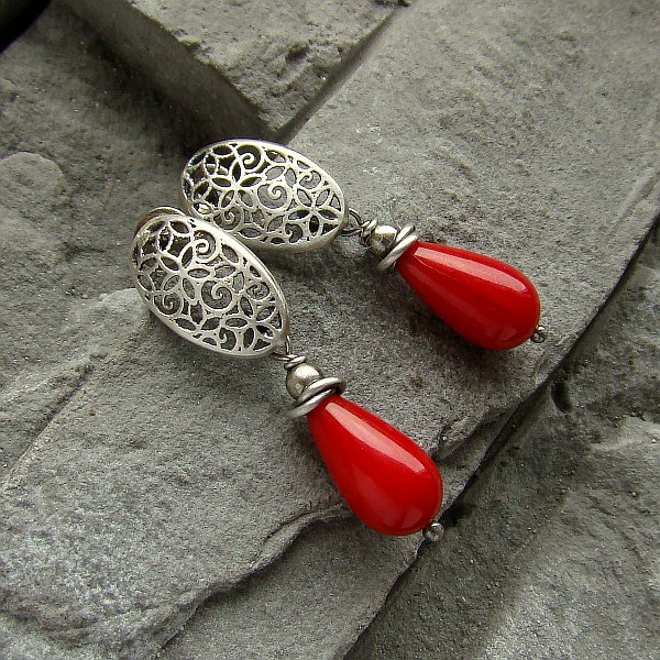 Wyjątkowe, romatyczne, eleganckie i kobiece kolczyki na wiele okazji, na co dzień i na wielkie wyjście. Wykonane w całości z oksydowanego srebra próby 925 oraz kropli czerwonego korala wielkości ok.1,2-1,3 cm. Zapięcia to misterne,romantyczne sztyfty. Całkowita długość kolczyków to ok. 3,2 cm. Ozdobnie zapakowane.