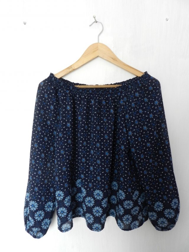 Romantyczna bluzka z gumka na ramionach utrzymana w kolorystyce niebieskiej i bieli