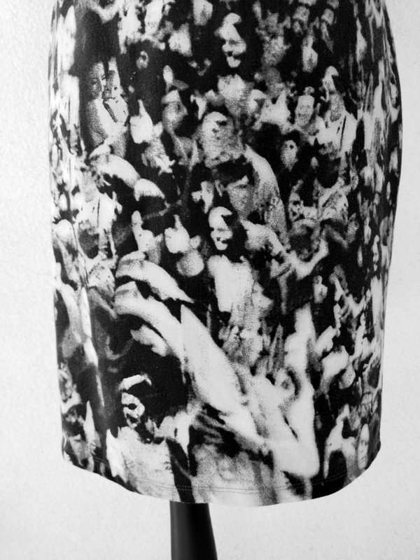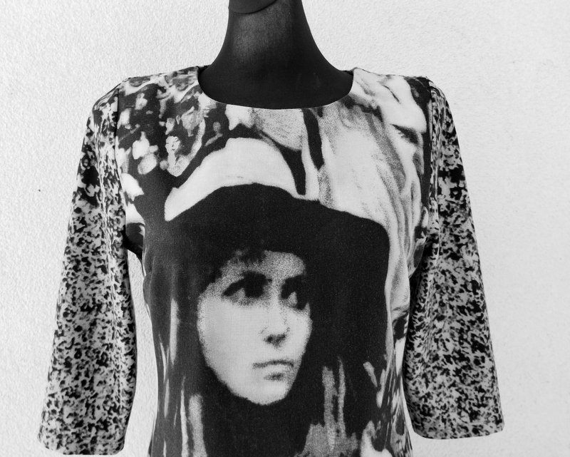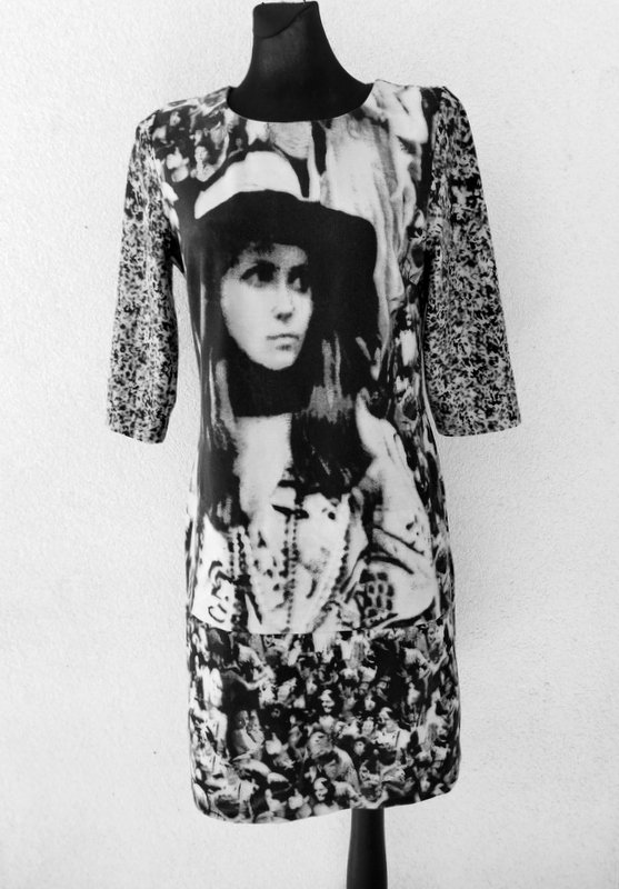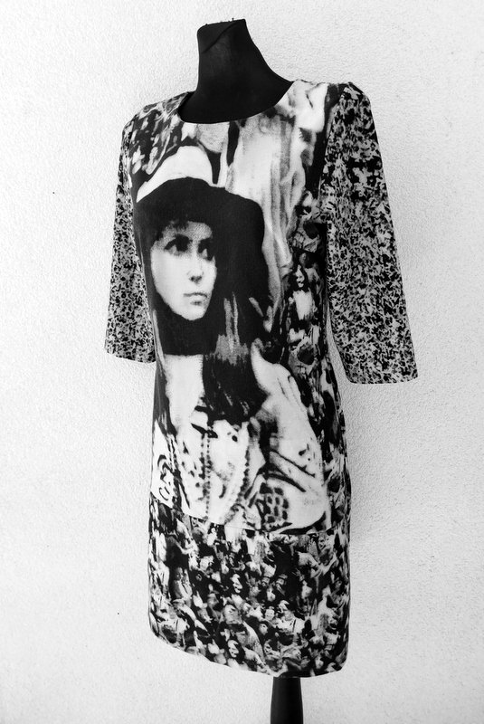 Sukienka z tęgiej tkaniny dzianinowej w szaro-czarnej kolorystyce . Wkładana przez głowę - bez zamka .
