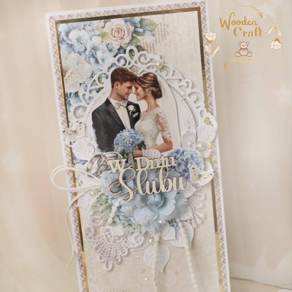Przepiękna i delikatna kartka ślubna, utrzymana w odcieniach brudnego beżu, błękitu i bieli z dodatkiem błyszczących złotych akcentów. Bogato zdobiona, wykonana ręcznie z dbałością o każdy szczegół z cudownej kolekcji papierów "Hydrangea". Kartka ozdobiona grafiką Pary, ślubnymi obrączkami oraz kompozycją kwiatową z ręcznie robionych materiałowych kwiatów, zdobiona perełkami, cekinami, a także tekturkowym napisem "W Dniu Ślubu".