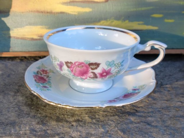 Porcelanowa filiżanka ze spodkiem, wytwórni w Chodzieży, sygnowana. Kolor biały, zdobiona romantycznymi kwiatkami i wypukłymi wzorkami oraz złoceniami. Klasyczna, zgrabna forma, bardzo kobieca.