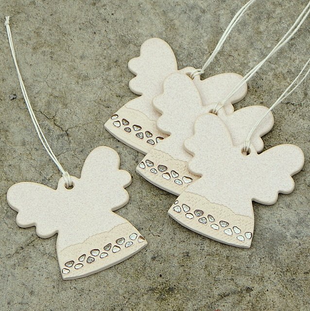 Zestaw 4 ceramicznych aniołków - zawieszek. Aniołki pokryte efektowym szkliwem ecru z przyozdobieniem w kolorze starego złota. Wymiary ok. 6 x 6 cm. Ozdobnie opakowane w pudełko. Polecam.