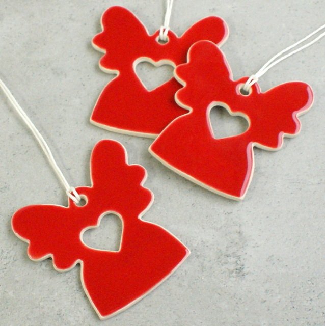 Zestaw 6 ceramicznych zawieszek - aniołków i bombek. Doskonała świąteczna ozdoba choinki, stroika albo paczki z prezentem. Ozdoby wykonane z białej gliny, pokryte przepięknymi błyszczącymi szkliwami w kolorze czerwonym. Wymiary - ok. 6 cm. Polecam.