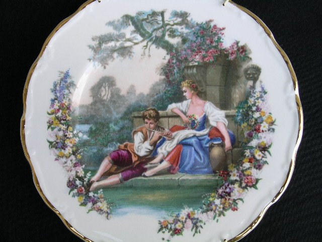 Dekoracyjny talerz porcelanowy, sygnowany Sheriden Staffordshire England. Rant ryflowany, falbanowy, złocony. Malatura satynowa. Urokliwość romantycznego przedstawienia :) Elegancki i ozdobny. 21 x 2,5 cm. Z tyłu profesjonalny uchwyt do powieszenia. Stan zachowania bardzo dobry.