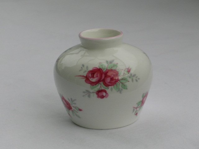Mały różany wazonik z urokliwym zdobieniem. Przyjemnie porcelaną dźwięczący. Sygnowany Crown Staffs. 5,5 x 5 cm. Stan zachowania bardzo dobry.