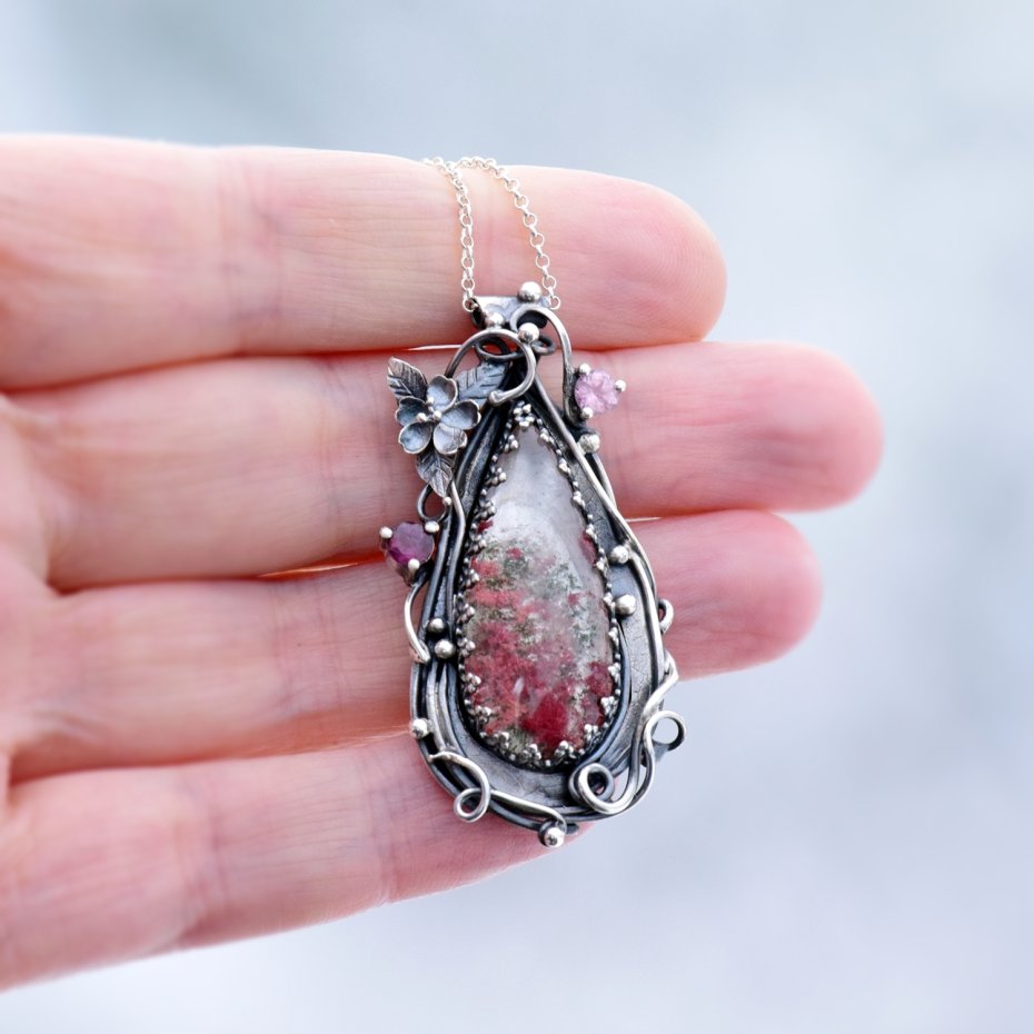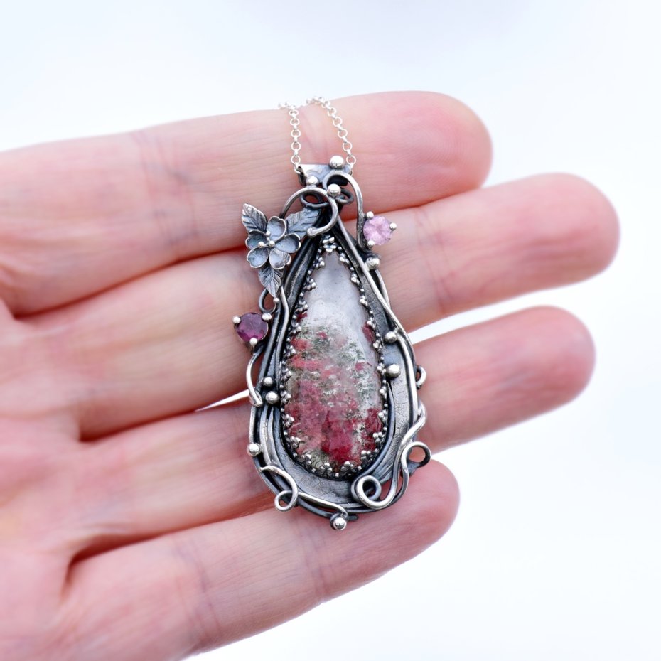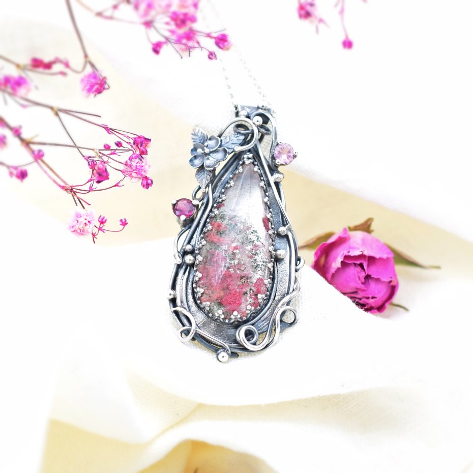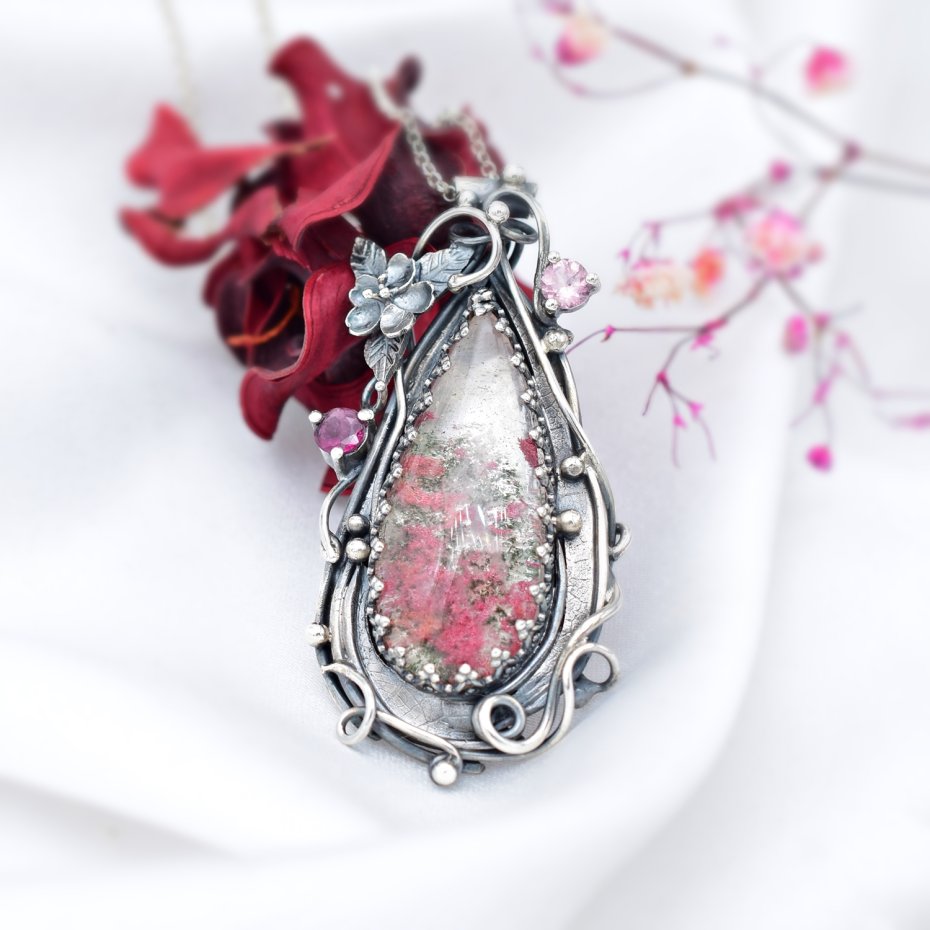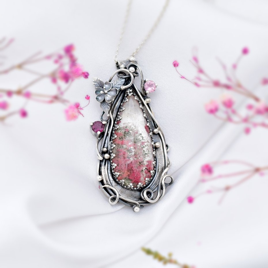 Romantyczny naszyjnik z kwarcem ogrodowym o wyjątkowych, malarskich inkluzjach przypominających delikatne kwiaty we mgle. Kamień oprawiony jest w falujące, organiczne linie ze srebra, ozdobione motywem kwiatu wiśni i różowymi turmalinami. Całość tworzy subtelną, harmonijną kompozycję inspirowaną kwitnącą wiśnią.