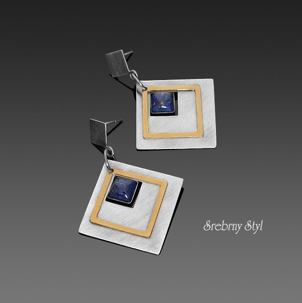 Odważne, nowoczesne kolczyki wykonane od podstaw własnoręcznie. Bazą kolczyków są duże srebrne kwadraty z wyciętym okienkiem, wewnątrz którego umieszczone zostały kaboszony lapis lazuli oprawione w srebro. Powierzchnia kwadratów oksydowana i mocno satynowana. Główną ozdobą są kwadratowe ramki, które pozłociliśmy 24-karatowym złotem. Zestawienie pozłacanego srebra ze złotymi inkluzjami lapisu tworzy ciekawe połączenie, sprawiając że kolczyki prezentują się niezwykle efektownie. Wszystkie elementy są ruchome, podczas ruchu delikatnie pobrzękują co przysparza kolczykom dodatkowego uroku. Całość podwieszona na kwadratowych sztyftach, które również zostały wykonane własnoręcznie. Powierzchnia sztyftów jest fakturowana a następnie oksydowana dla podkreślenia faktury i satynowana.