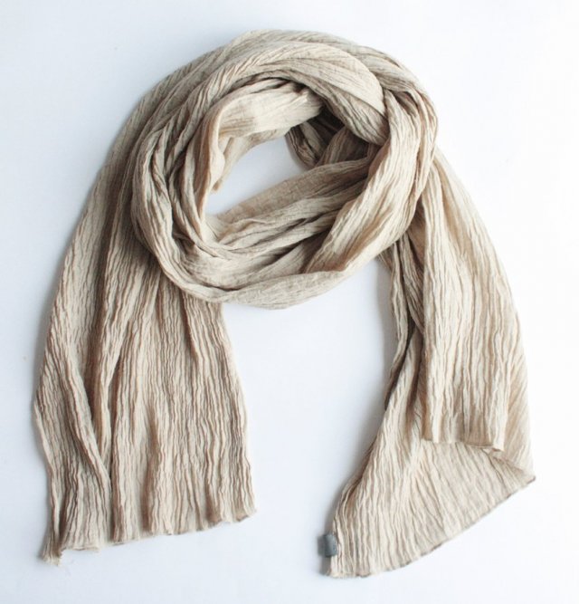 Duży, beżowy szal o ciekawej, karbowanej strukturze. Materiał jest miękki, miły w dotyku (jest to prawdopodobnie bawełna lub wiskoza).
