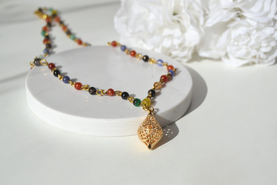Naszyjnik z kolorowymi agatami 6mm, wzbogacony pięknym wisiorkiem w stylu boho pokrytym 18 karatowym złotem.