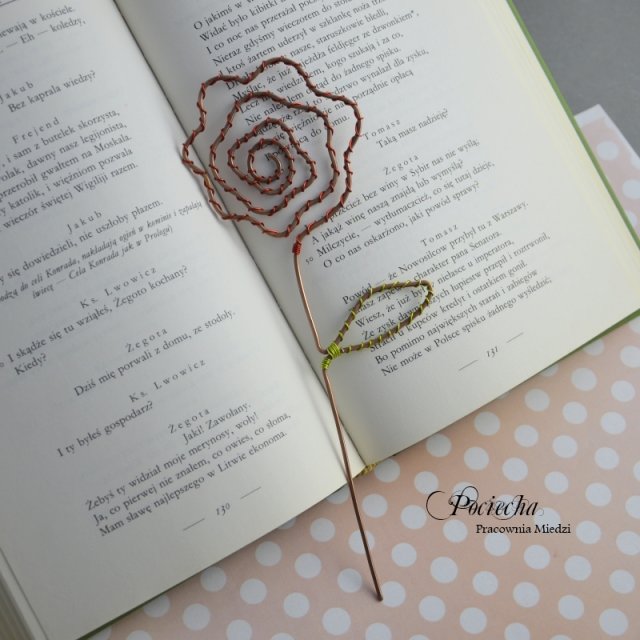Zakładka w kształcie róży. Wykonana od podstaw ręcznie z miedzi.
