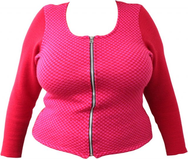 Taliowany kardigan na suwak w mocnych odcieniach fuksji i czerwieni duńskiej marki Roselli. Tył czerwony. Sweterek zaprezentowany na osobie noszącej 46. Materiał uciąga się. Wymiary podane mierzone na płasko.