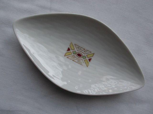 Porcelanowy talerzyk,paterka sygnowany jakością Rosethal z bardzo rzadko spotykanej serii Original Inka Motivs.Dodatkowa sygnatura numeryczna - 52. Kszatt rodem z designu lat 60ych,delikatne zdobienie podszkliwne na bieli również ... no i graficzny motyw inkaski w oryginale przeniesiony na porcelanę :) 14 x 7,5 x 1,5 Stan zachowania bdb minus za drobne przytarcie inkaskiego wzoru...co nieco uantycznia ten piękny przedmiot :) Kolekcjonerska perełka :)
