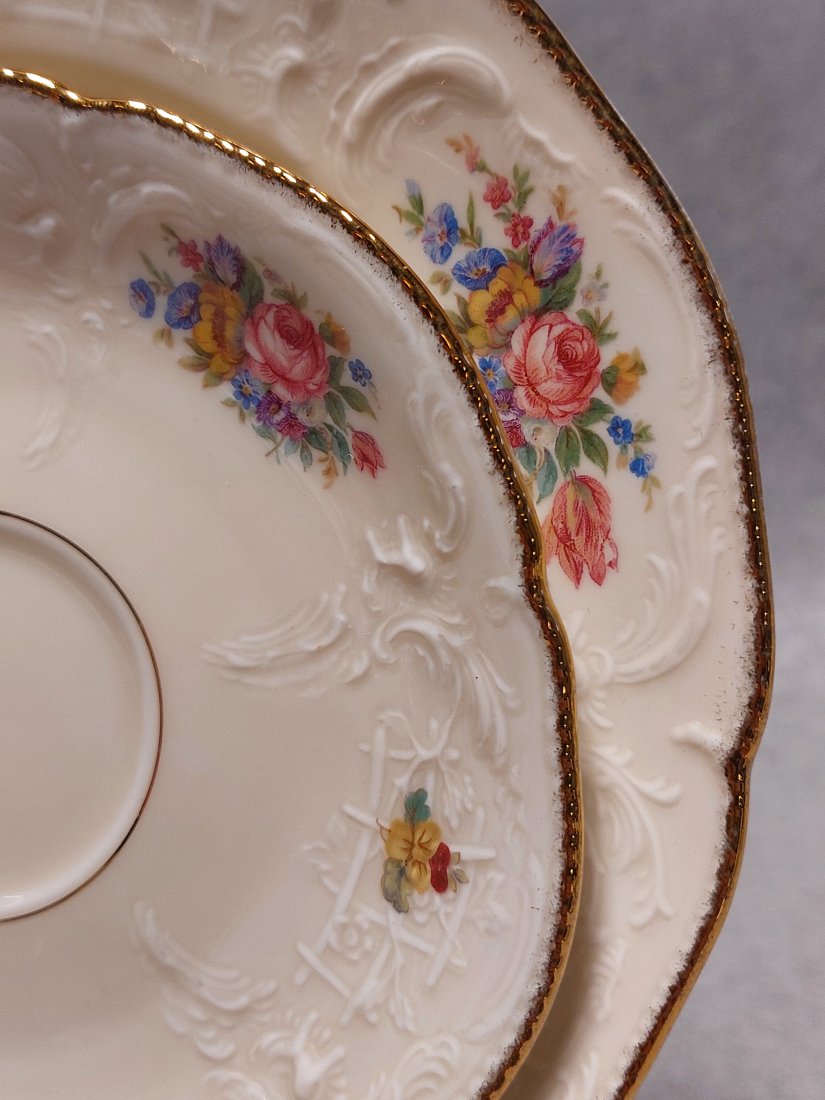 Podobnie jak na spodku, na talerzyku widoczne są reliefy i mniejsze bukieciki kwiatów,