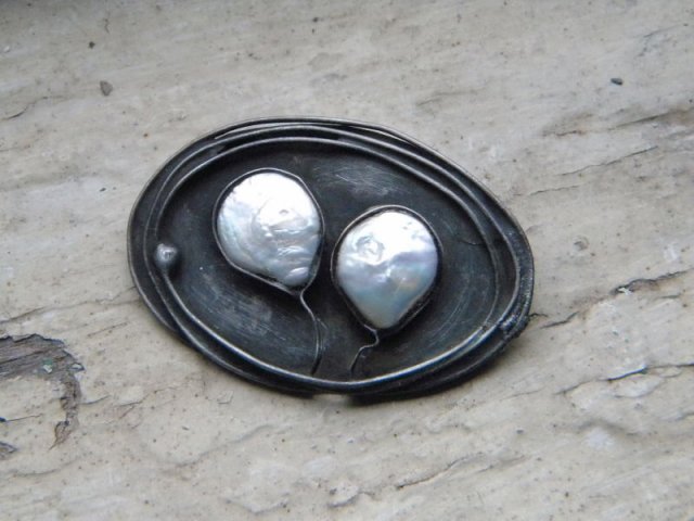 broszka. perły w ocynowanej miedzi. wymiary 5cm x 3,4cm. stylizowana na stare srebro.