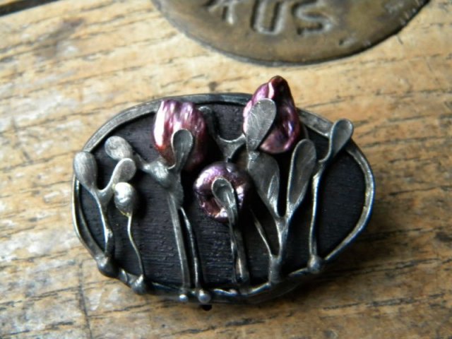 broszka.Perły w ocynowanej miedzi na drewnianym owalu. wymiary 4,5cm x 3,2cm. stylizowana na stare srebro.
