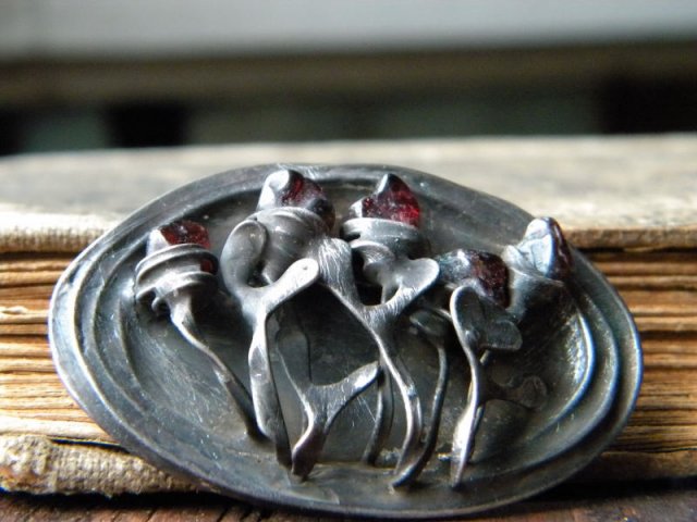broszka. surowe granaty w ocynowanej miedzi. wymiary 5cm x 3,3cm. stylizowana na stare srebro.