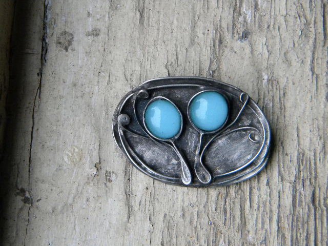 broszka. szkło w ocynowanej miedzi. wymiary 4,8cm x 3,4cm. stylizowana na stare sre