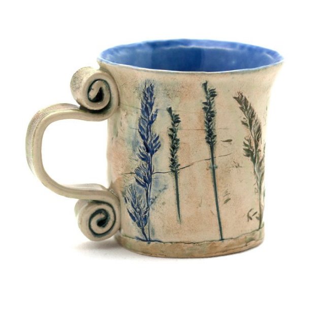 Jest to ręcznie wykonany kubek ceramiczny z motywem roślinnym, deformowany - z wybrzuszeniami i wklęsłościami.