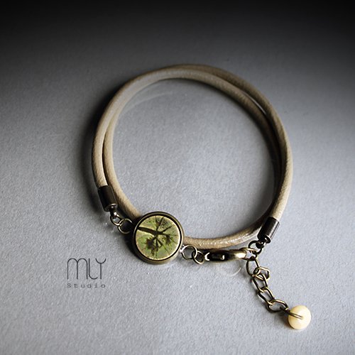 Efektowna bransoletka wykonana z linki kauczukowej w kolorze beżowym, elementów w kolorze starego złota i ręcznie wykonanej ceramicznej zawieszki, szkliwionej mieszanką zielonych szkliw z efektem plamek o subtelnym połysku, Obwód regulowany. Polecam