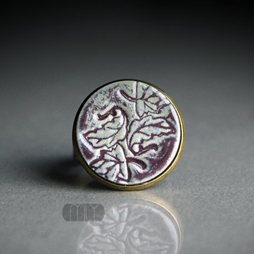 Oryginalna ceramiczna broszka, wykonana z delikatnej gliny kamionkowej, szkliwiona szaro fioletowym szkliwem o pięknym połysku, zapięcie w kolorze starego złota. Długość ok. 2cm. Polecam