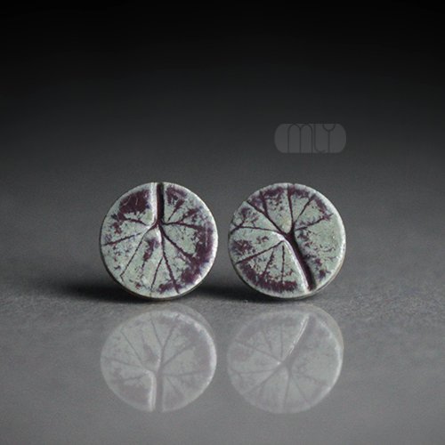 Ceramiczne okrągłe kolczyki w formie sztyftów, ręcznie wykonane z delikatnej jasnobeżowej gliny kamionkowej, dekorowane wgłębnym motywem roślinnym, jednostronnie szkliwione mieszanką zielonkawo szarego i fioletowego szkliwa, na sztyftach w kolorze srebrnym.Średnica ok. 11mm.. Polecam