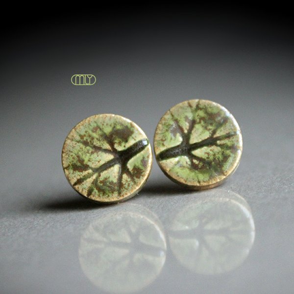 Ceramiczne okrągłe kolczyki w formie sztyftów, ręcznie wykonane z delikatnej jasnobeżowej gliny kamionkowej, dekorowane wgłębnym motywem roślinnym, jednostronnie szkliwione mieszanką zielonych szkliw, na sztyftach w kolorze srebrnym.Średnica ok. 11mm.. Polecam