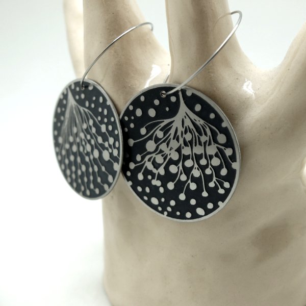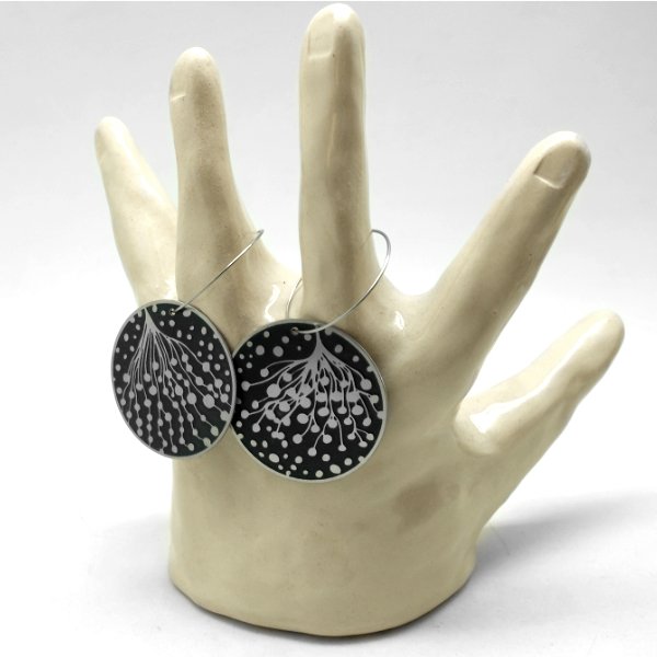 Duże wiszące kolczyki koła z motywem roślinnym wykonanym według autorskiej grafiki. Wykonane z emaliowanej stali nierdzewnej srebra próby 0,925 (bigiel). Lekkie i połyskujące na słońcu, kolczyki koła są cały czas w ruchu. Długie na 5 cm. Koło z motywem roślinnym ma średnicę 3 cm.