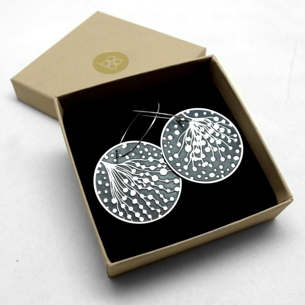 Kolczyki opakowane w firmowe ekologiczne pudełko. Opakowanie bez użycia plastiku.