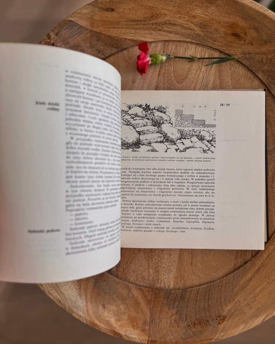 Książka z pięknymi kolorowymi ilustracjami kwiatowymi na każdej kartce + praktyczne porady jak założyć i pielęgnować ogród skalny.