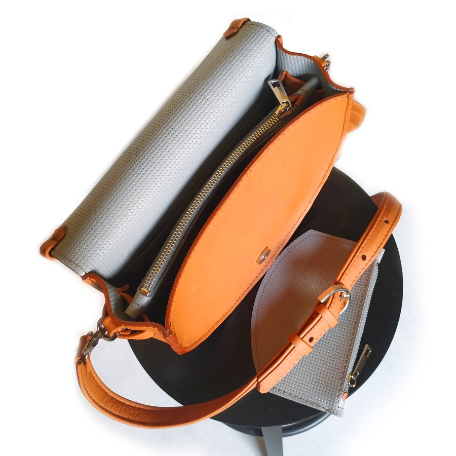-wierzch torebki pomarańczowa skóra licowa, środek skórzana szara futrówka