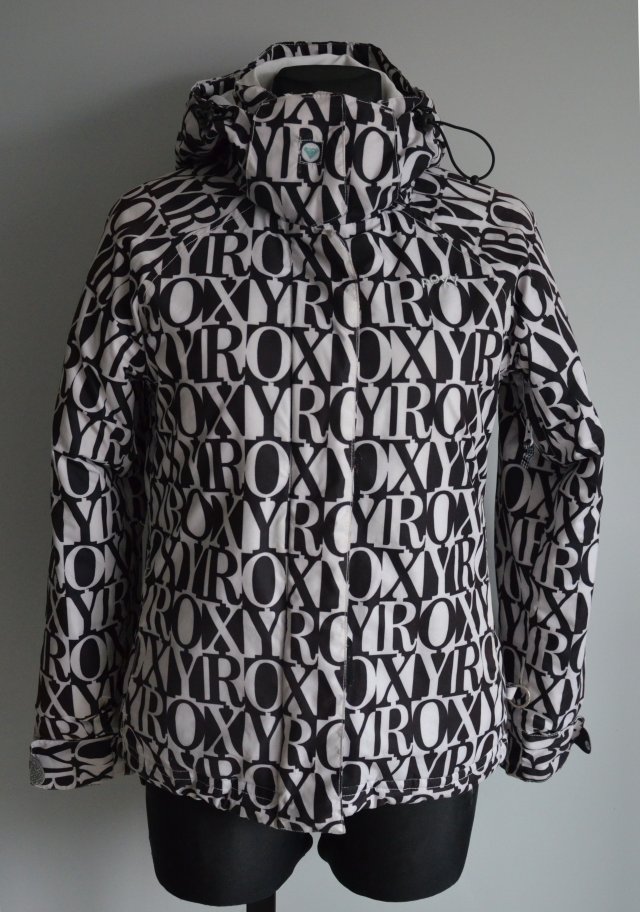 Damska kurtka sportowa marki ROXY. Biała, ozdobina wzorem z brązowych liter. Kaptur odpinany, na zatrzaskach, ściągacze na gumkach. Zapinana na zamek, rzepy i trzy zatrzaski. Wewn. kieszonka oraz dodatkowy pas na gumce chroniący prezd podwianiem, zapinany na zatrzaski. Na dole ściągana na gumkach. Z przodu dwie kieszonki zapinane na rzepy. Rękawy z dodatkowym, wewn. ściągaczem, zapinane na rzepy. Wentylacja od pachami, odpinana na zameczki.