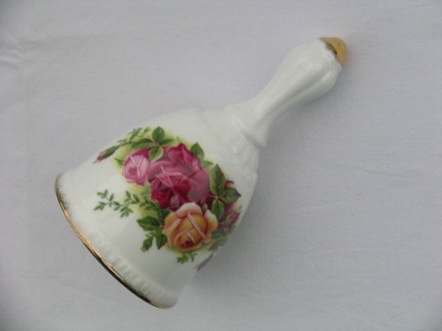 Dzwonek porcelanowy z kolekcjonerskiej serii Old Country Roses, sygnowany Royal Albert, England. Charakterystyczny wzór różany, delikatne ryflowanie, złocenia i błyszczące szkliwienie. 7 x 12 cm. Stan zachowania bardzo dobry.