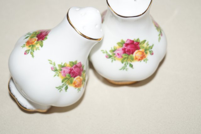 Porcelanowy duet- pieprzniczka i solniczka sygnowane ROYAL ALBERT z serii OLD COUNTRY ROSES, porcelana w kolorze mlecznej bieli ozdobiona klasycznym motywem różanym, brzegi falbanowane i ozdobione złoceniem, elegancki kształt