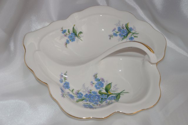 Piękny kabaret zdobiony niezapominajkami, obrzeże złozone, porcelana biała i błyszcząca, sygnowany ROYAL ALBERT .