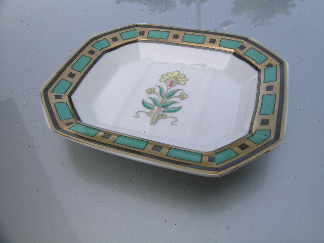 Uroczo katna Porcelanowa Mydelniczka sygnowana ROYAL ASHMORE. Ciekawy kształt i eleganckie zdobienie. Wewnątrz na dnie wypukłe pionowe linie dla dystansu mydła. Biala porcelana na błyszcząco szkliwiona. Wzór na rancie grafoczny satynowo-blyszczący. Złocony i zielony okraszony antracytowymi paskami. Na dnie delikatnymi złotymi liniami podkreślony wzór kwiatowy.