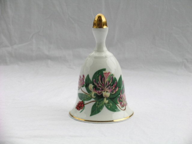 Duży porcelanowy dzwonek z limitowanej edycji od Danbury Mint - tutaj wrześniowe zdobienie wiciokrzewne :) Jakość wykonania, głębokie złocenie stylizowanej rączki i błyszczące szkliwienie. Przyjemnie i donośnie dźwięczy. 8 x 12 cm. Stan zachowania bardzo dobry. Wartość kolekcjonerska.