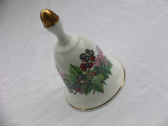Duży porcelanowy dzwonek z limitowanej edycji od Danbury Mint - tutaj październikowe zdobienie jeżynowe :) Jakość wykonania, głębokie złocenie stylizowanej rączki i błyszczące szkliwienie. Przyjemnie i donośnie dźwięczy. 8 x 12 cm. Stan zachowania bardzo dobry. Wartość kolekcjonerska.