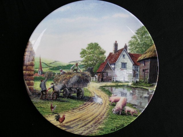 Kolekcjonerski talerz dekoracyjny z limitowanej edycji Crinkley Bottom z malaturą autorstwa Micka Bensleya. Seria scen z prawdziwego, dawnego życia angielskiej wsi - klimatyczny, historyczny, malarski :)Notowany na międzynarodowej liście Bradexu (26-R62-58.6) z indywidualnym numerem 1287A. Najwyższa jakość dźwięczącej porcelany i precyzyjnego barwnego zdobienia. Z tyłu dziurki do powieszenia. Średnica 21,5; wys. 1,5 cm. Stan zachowania bardzo dobry.