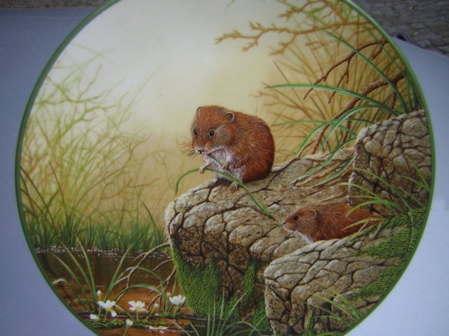 Jakościowy Porcelanowy Talerz Kolekcjonerski. Sygnowany ROYAL DOULTON Bone China Made in England " FORAGING BANK VOLES" by W.Geoff Rollinson. Drugi z serii Rollinsons Portraits od Nature. Pierwsza limitowana ,ekskluzywna edycja - wykonywana tylko przez 150 dni. w 1988 roku. Talerz posiada swój indywidualny numer na międzynarodowej liście Talerzy kolekcjonerskich BRADEX 26-R62-25.2,oraz swój numer w serii. 3183 B. Odręczny podpis autora.na awersie i rewersie.