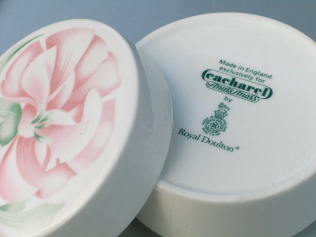 Kultowa to rzecz :) Porcelanowe Puzdro ona Biżuterię sygnowane CACHAęL DOULTON Bone China Made in England exclusively fo CACHAREL Anais Anais...Kultowe perfumy Cacharel doczekały się porcelanowej serii...noo...i Royal Doulton jako marka firmująca :)