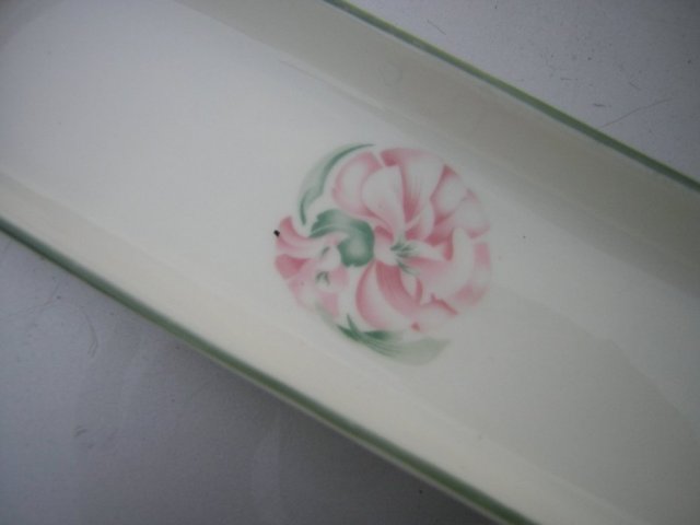 Jakość porcelany bez zarzutu :) Biel piękna,głęboka ,wykończenie błyszczące. Delikatny wzór,niuanse różu i zielenie...Rant zielony. Jak to u Doultona ...wręcz można dotknąć jakości i klasy :) Idealna na kredki...ołówki, lub na biżuterię ;)