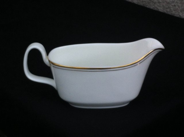 Klasycznej, ponadczasowej elegancji duża sosjera ze szlachetnej porcelany od Royal Doulton, sygnowana, z ekskluzywnej serii obiadowej Gold Concord. Śmietanowa biel porcelany i ręcznie malowane złote pasy przy rancie. Wygodna, prostotą elegancka forma. 19,5 x 8 x 9 cm. Stan zachowania bardzo dobry. Najwyższa jakość, gwarantowana przyjemność przy stołowaniu :)