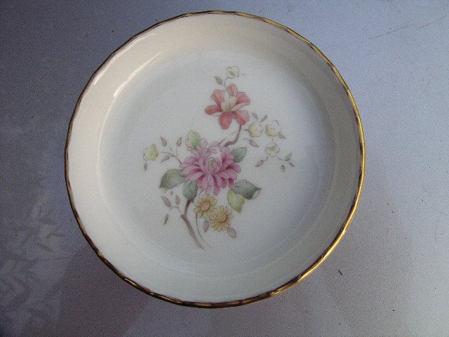 Na ciepłej bieli porcelany delikatne we wzorze i kolorze kwiatowe zdobienie. Rant delikatnie falbankowy,złocony.
