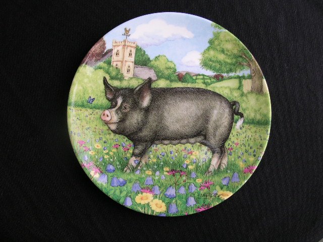 Dekoracyjny talerz porcelanowy z fantastycznej kolekcjonerskiej serii Pigs in Bloom z fantastycznymi świńskimi rysunkami autorstwa Debbie Cook. Najwyższa jakość porcelany od Royal Doulton, szlachetnie dźwięcząca, pod światło prześwitująca, na jedwabiście połyskiem szkliwiona. Z jednej strony - jaka świnia jest... każdy widzi :) ale z drugiej - każda fantastyczna, każda pojedyncza, każda w innej wiejskiego krajobrazu odsłonie ukazana, z właściwą botaniką... no i odmiennością własnej rasy :) Po prostu mistrzostwo świata - i dowcip, i kolor, i sielskość, i jakość... o elegancji nie wspominając :) Średnica 21; wys. 1,5 cm. Stan zachowania bardzo dobry. Z tyłu profesjonalna nalepka z haczykiem do powieszenia.