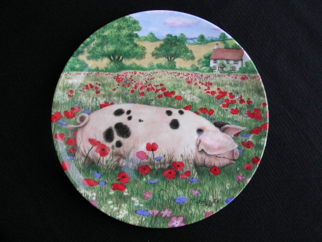 Dekoracyjny talerz porcelanowy z fantastycznej kolekcjonerskiej serii Pigs in Bloom z fantastycznymi świńskimi rysunkami autorstwa Debbie Cook. Najwyższa jakość porcelany od Royal Doulton, szlachetnie dźwięcząca, pod światło prześwitująca, na jedwabiście połyskiem szkliwiona. Z jednej strony - jaka świnia jest... każdy widzi :) ale z drugiej - każda fantastyczna, każda pojedyncza, każda w innej wiejskiego krajobrazu odsłonie ukazana, z właściwą botaniką... no i odmiennością własnej rasy :) Po prostu mistrzostwo świata - i dowcip, i kolor, i sielskość, i jakość... o elegancji nie wspominając :) Średnica 21; wys. 1,5 cm. Stan zachowania bardzo dobry. Z tyłu profesjonalna nalepka z haczykiem do powieszenia.
