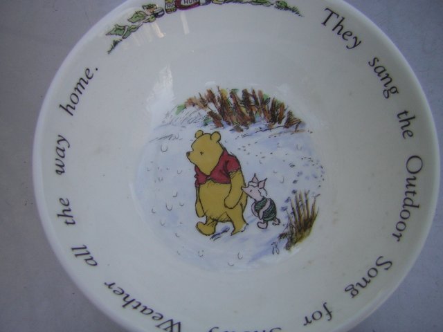 Porcelanowa miseczka.Sygnowana WINNIE THE POOH ROYAL DOULTON DISNEY. Wielkość idealna na poranną zupkę mleczną. Mocna, solidna, dźwięcząca porcelana. Szlachętna malatura, urocze zdobienie. Miś Puchatek z prosiaczkiem w stonowanych barwach. Wykończenie błyszczące. W oryginalnym tekturkowym pudełku. Kolekcjonerska seria dla dzieci. Użytkowa, dekoracyjna, na prezent, do kolekcji. Miska - góra trochę ponad 15 cm dół 8 cm wys. 5 cm Stan zachowania bardzo dobry. Pudełko 16 x 16 x 7,5 cm Stan zachowania dobry. Ślady użytkowania, bez większych wad.
