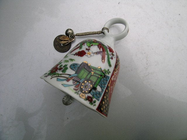 Bardzo mocno dzwięczny Porcelanowy Dzwonek. Sygnowany ROYAL DYNASTY. Mocna, biała porcelana,kolorowe orientalne zdobienie złotem okraszone Wygodne ucho do trzymania i powieszenia.Dół nieco falbankowy.. Doczepiona pleciona zawieszka z moneta na szczęście,złotymi klapkami i metalowym dzwoneczkiem. Serce dzwonu na łańcuszku szklano-kryształkowe. Wykończenie błyszczące.