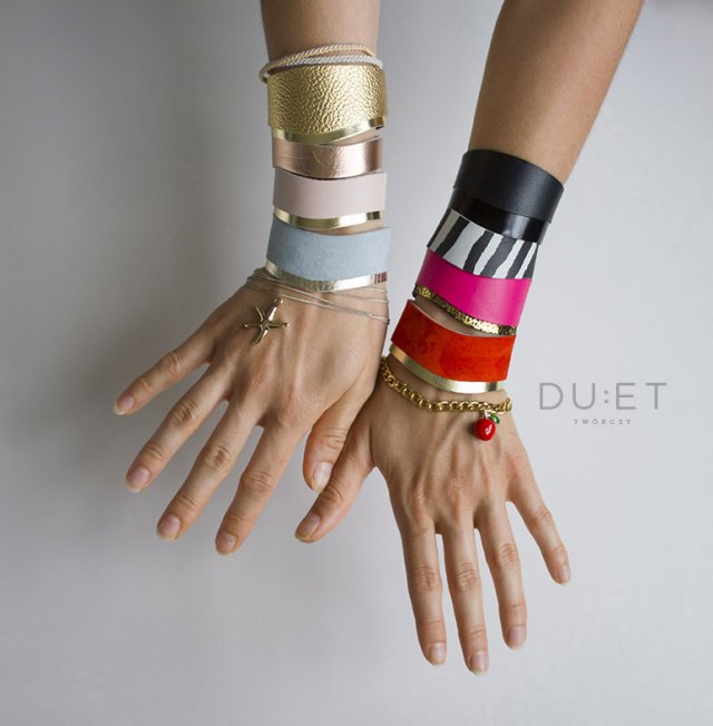 Elegancka i wyrazista bransoleta wykonana ręcznie ze skór naturalnych w kolorach: jasny złoty, jarzębinowa czerwień (zamsz), pudrowa czerwień (zamsz).
