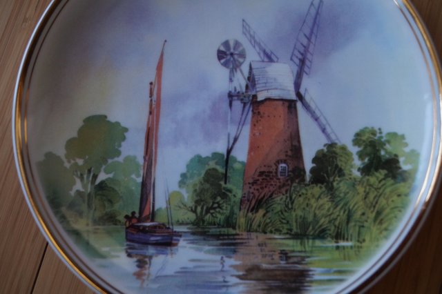jakościowa porcelana ozdobiona nadrukiem z motywem wiejskim, gdzie motyw przewodni stanowią wiatraki
